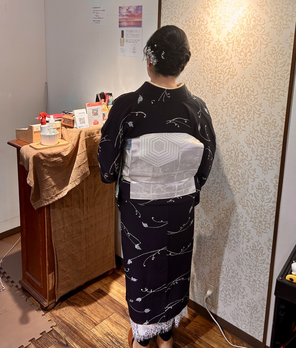 今回、ダンスバトルのご招待をされたそうで、普通の着付とは違い、裾丈を短くして、レースのペチコートが見える様に着付しました。
